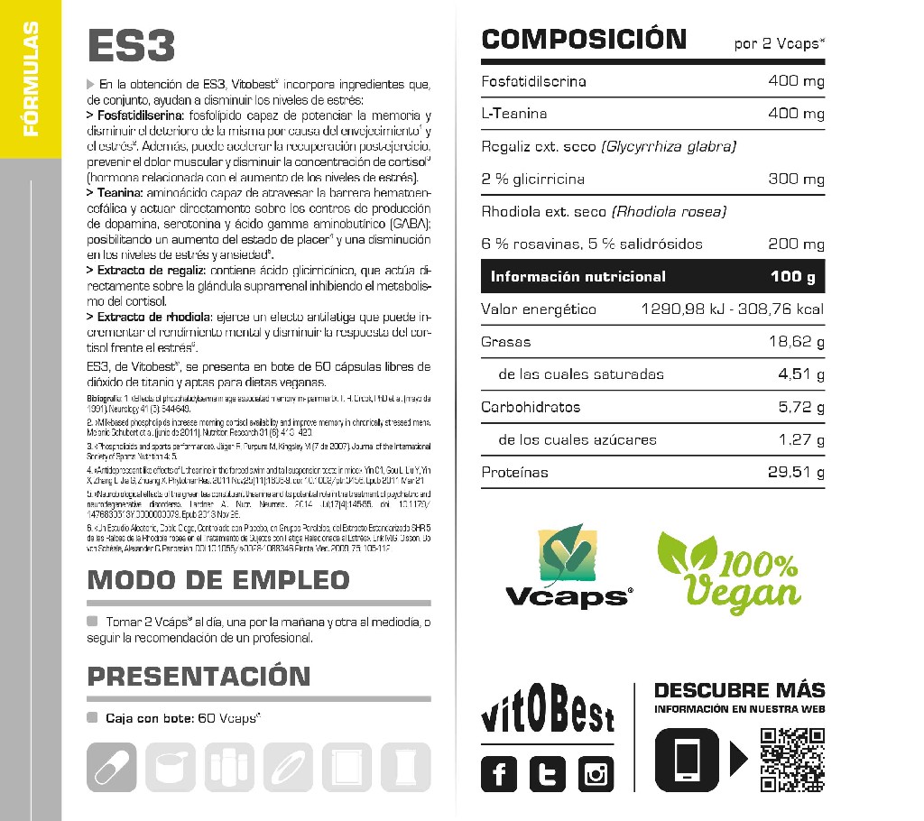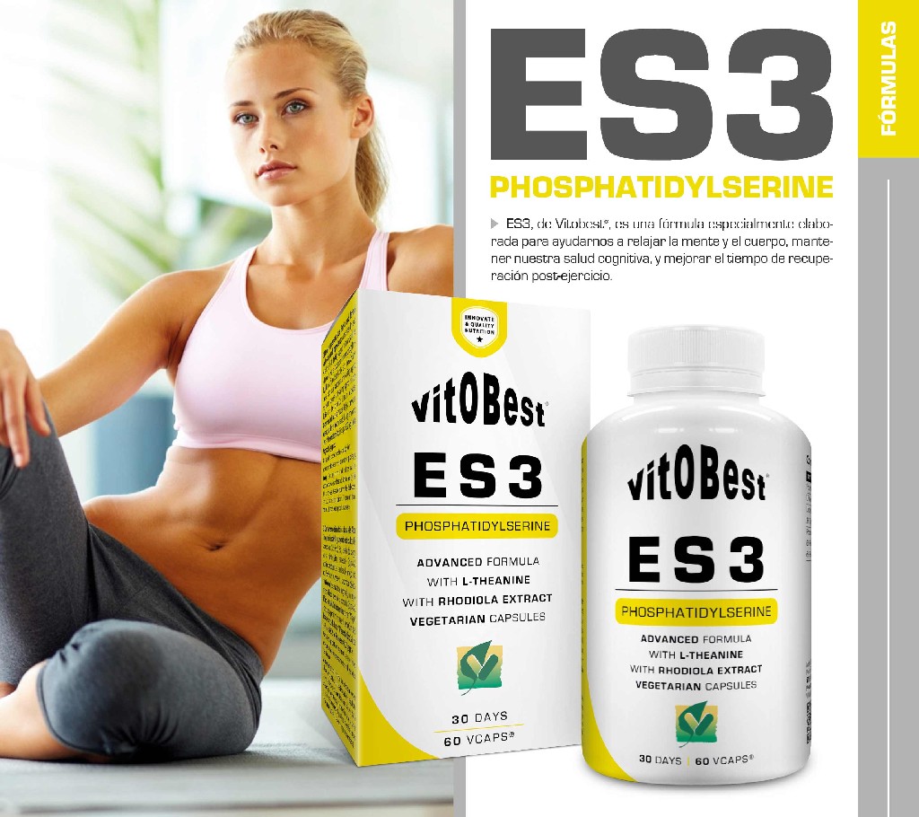 ES3, de Vitobest®, es una fórmula especialmente elaborada para ayudarnos a relajar la mente y el cuerpo, mantener nuestra salud cognitiva, y mejorar el tiempo de recuperación post-ejercicio.En la obtención de ES3, Vitobest® incorpora ingredientes que ayudan a disminuir los niveles de estrés:Fosfatidilserina: fosfolípido capaz de potenciar la memoria y disminuir el deterioro de la misma por causa del envejecimiento1 y el estrés2. Además, puede acelerar la recuperación post-ejercicio, prevenir el dolor muscular y disminuir la concentración de cortisol3 (hormona relacionada con el aumento de los niveles de estrés).