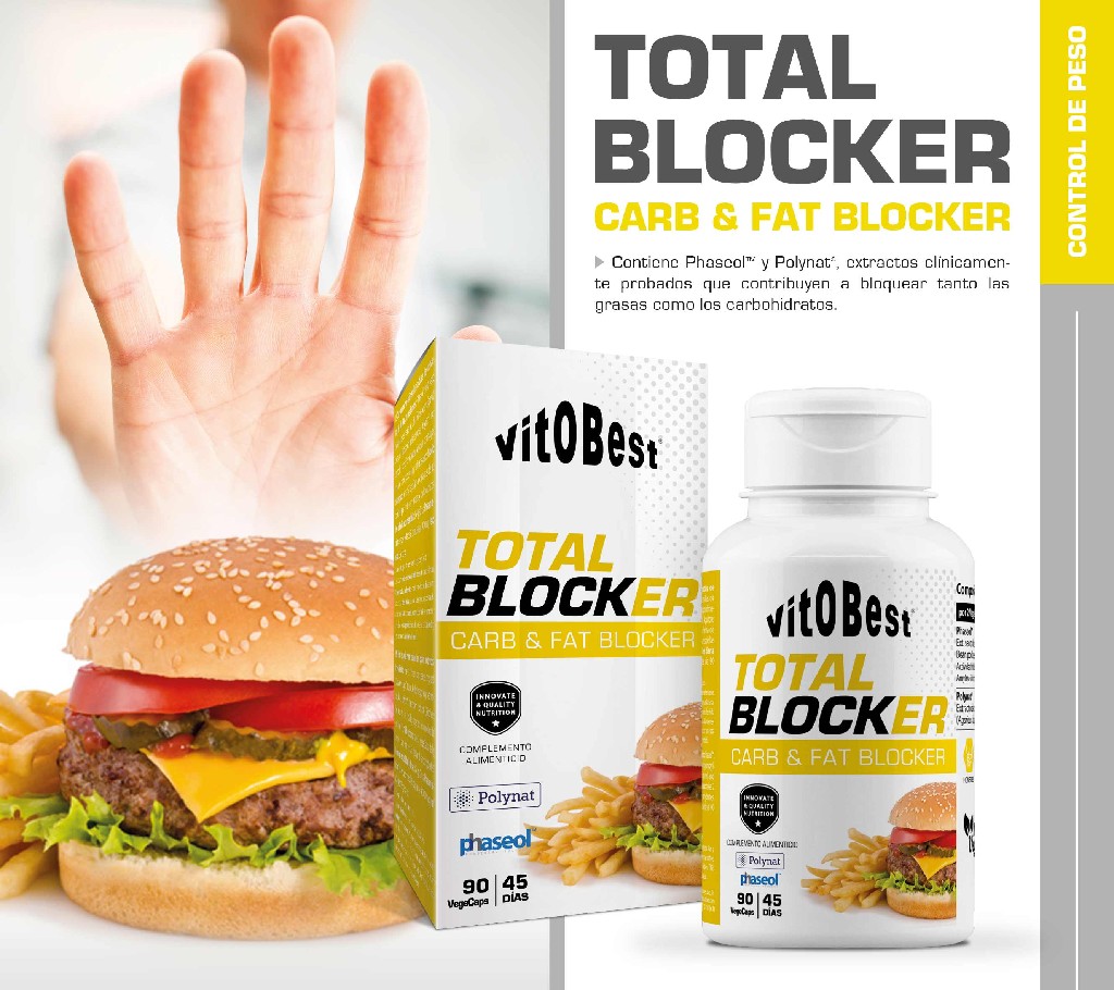 Diseñado para ayudarnos a mantener una dieta saludable, Total Blocker, de Vitobest®, es una formulación única elaborada a partir de Polynat® y Phaseol™, dos extractos vegetales de la más alta calidad en el mercado:Polynat® es un revolucionario compuesto de polisacáridos de polímero de champiñón. Esta especie es una buena fuente de fibra (2 g por 100 gramos de alimento) y su principal componente es la quitina, un polímero de N-acetilglucosamina que proporciona sensación de saciedad, aumenta el volumen fecal y mejora el tránsito intestinal, con lo que disminuye la absorción de grasa1,2.